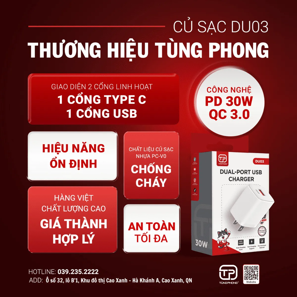 Củ Sạc DU03 TP Chống Cháy, Sạc Nhanh DU03 30W – 2 Cổng Sạc USB – A, TYPE C